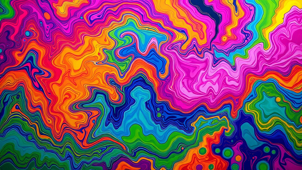 Psychedelic fluid art with vibrant neon hues, featuring a fusion of colors including lush green, deep cobalt blue, vivid ruby red, dazzling orange, sunny yellow, and lively pink, swirling together with intricate detail to evoke the essence of a mystical landscape.