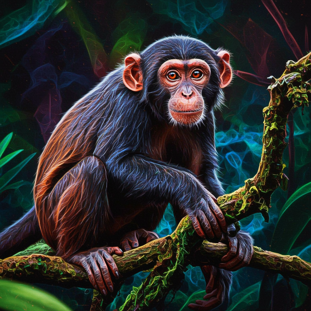 Psychedelic-inspired monkey artwork featuring vibrant neon colors with a focus on glowing effects, intricate patterns, and abstract elements that highlight the energy and playfulness of the animal in a fantastical jungle setting.