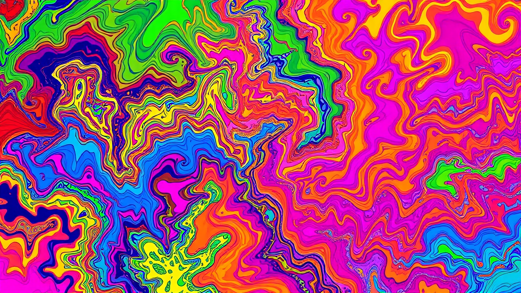 Psychedelic liquid art with vibrant neon hues, featuring a fusion of emerald green, cobalt blue, ruby red, blazing orange, radiant yellow, and vivid pink. The piece is a highly detailed explosion of color, evoking a sense of ethereal beauty and fluid motion, with intricate patterns weaving through a vibrant landscape.