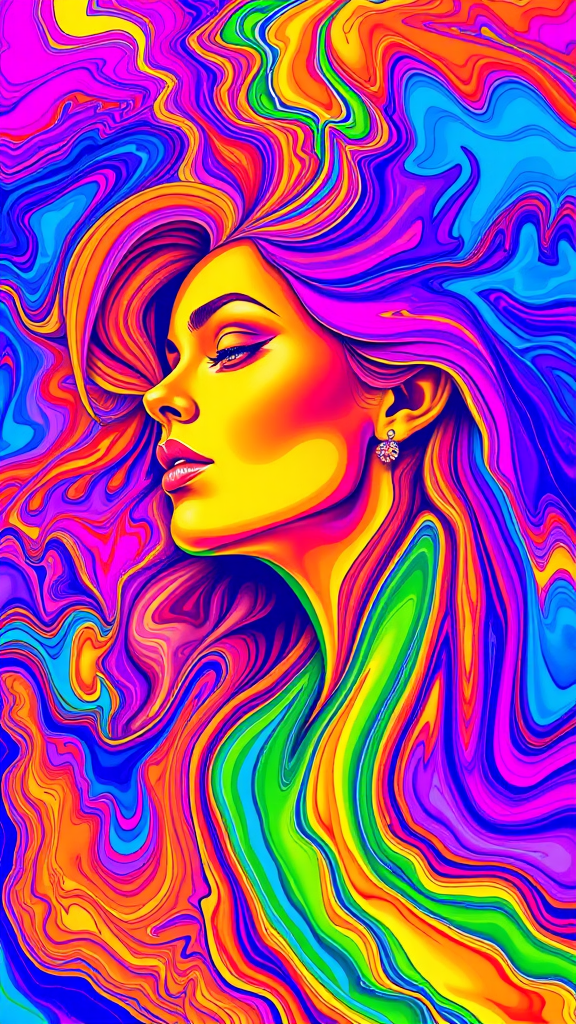 Psychedelic liquid artwork, vibrant neon hues of cyan, cobalt blue, emerald green, ruby red, fiery orange, sunflower yellow, and electric pink, depicting a woman in a dynamic swirl of colors, highly detailed imagery with a fluid, organic flow, mesmerizing and vivid composition.