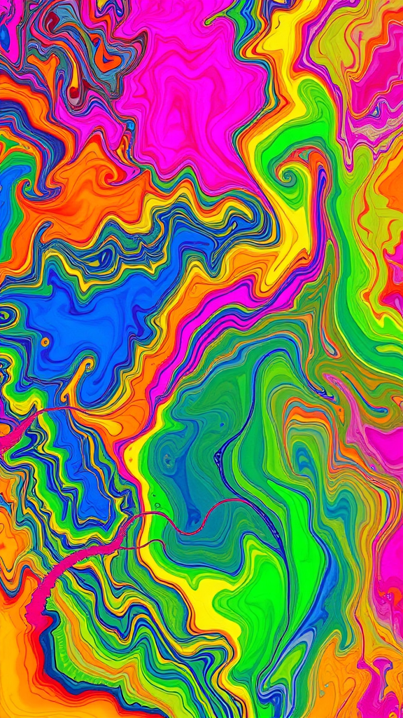 Psychedelic liquid painting featuring a mesmerizing fusion of neon colors; vibrant hues of green, cobalt blue, ruby red, fiery orange, sunny yellow, and electric pink dance together. The composition is a tapestry of swirling patterns and intricate details, capturing the essence of dreamy abstraction and vivid imagination. The artwork evokes a sense of fluid motion and transformative energy, inviting viewers into a surreal kaleidoscope of color and emotion.