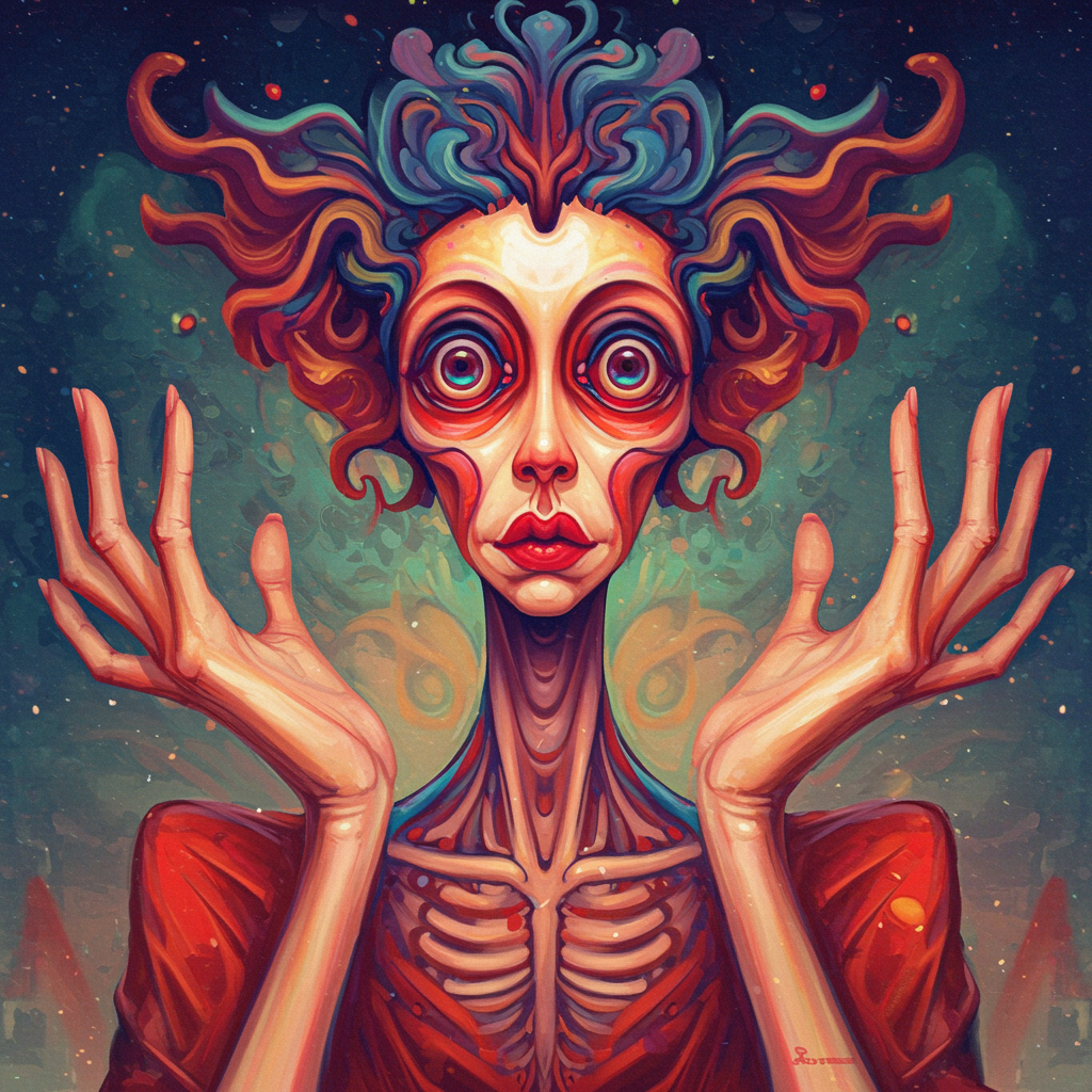 An imaginative psychedelic portrait radiating with a vibrant color palette, infused with meticulous detail in a romanticism-inspired style that is both cinematic and reminiscent of the works seen on artstation. Drawing influence from the visionary aesthetics of artists like Moebius and Greg Rutkowski, the artwork presents an expressive quality, albeit with intentional imperfections and quirks such as subtle jpeg artifacts and blurred details. The portrait features a character with an abstractly exaggerated form, including whimsical interpretations of anatomy such as playful distortions of hands and facial features, imbuing the image with a surreal and dreamlike essence. The composition suggests a sense of movement and fluidity, with elongated neck and limbs, capturing an otherworldly charm amidst its intentionally flawed portrayal. Elements are creatively out of frame, giving an impression of expansion beyond the canvas, while maintaining an avant-garde and thought-provoking narrative through its intentional inconsistencies and imaginative, artistic expression.