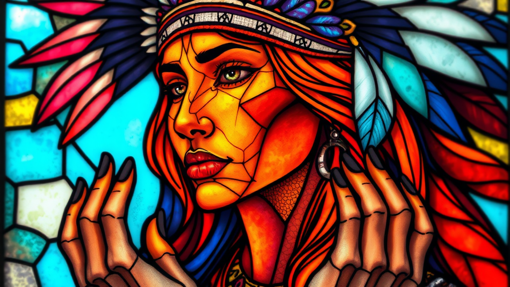 Psychedelic stained glass portrait of a North American Indian woman, adorned with vibrant feathers, orange flowing hair and vividly colored skin, UHD, HDR, 8K, features intricately detailed yet abstract facial expressions, elongated neck, hands with unusual finger count, and a dreamy, surreal look in her eyes, maintaining an artistic blend of colors and shapes without distortions or blurriness.