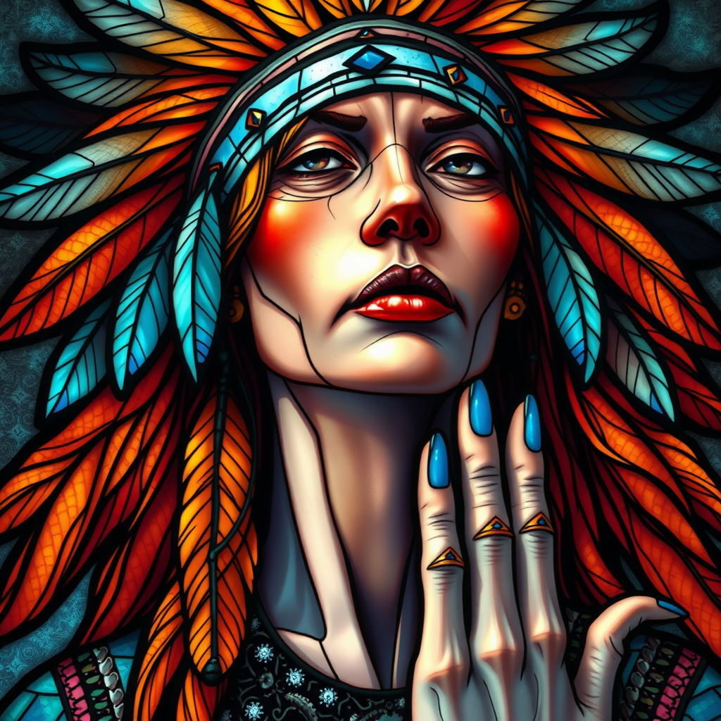 Psychedelic stained glass portrait of a North American Indian woman, adorned with feathers in her vibrantly colored orange flowing hair, UHD, HDR, 8K resolution, surreal elements with abstract features, elongated neck, extra fingers creating a unique, avant-garde interpretation, intricate detail, sharp focus, vivid color contrasts, artistic distortion, maintaining a sense of beauty amidst complexity, exploring themes of duality and transformation.