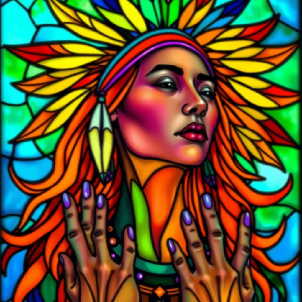 Psychedelic stained glass portrait of a North American Indian woman with vibrantly colored feathers in her hair and flowing orange hair, featuring UHD, HDR, and 8K detail. The portrait includes unique artistic elements like abstract facial features and elongated neck, creating an otherworldly appearance. The hands appear with extra fingers, adding a surreal twist. Avoid low resolution effects or background distractions to ensure a clean and immersive visual experience.