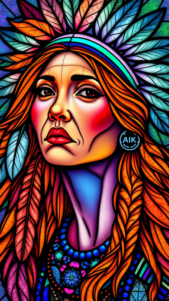 Psychedelic stained glass portrait of a North American Indian woman, featuring vibrantly colored feathers in her hair and striking orange flowing hair. The portrait is rendered in UHD, HDR, 8K resolution with unique creative elements. The depiction includes elements of cloning and mutation, resulting in a surreal image with elongated neck, extra fingers, and unconventional facial features such as cross-eyed, lazy-eyed, and wonky-eyed expressions. Avoid low resolution, out-of-frame details, blurriness, and artifacts. Ensure the image is seamless, without watermarks, logos, or words, avoiding poorly drawn cartoonish qualities and maintaining artistic integrity.
