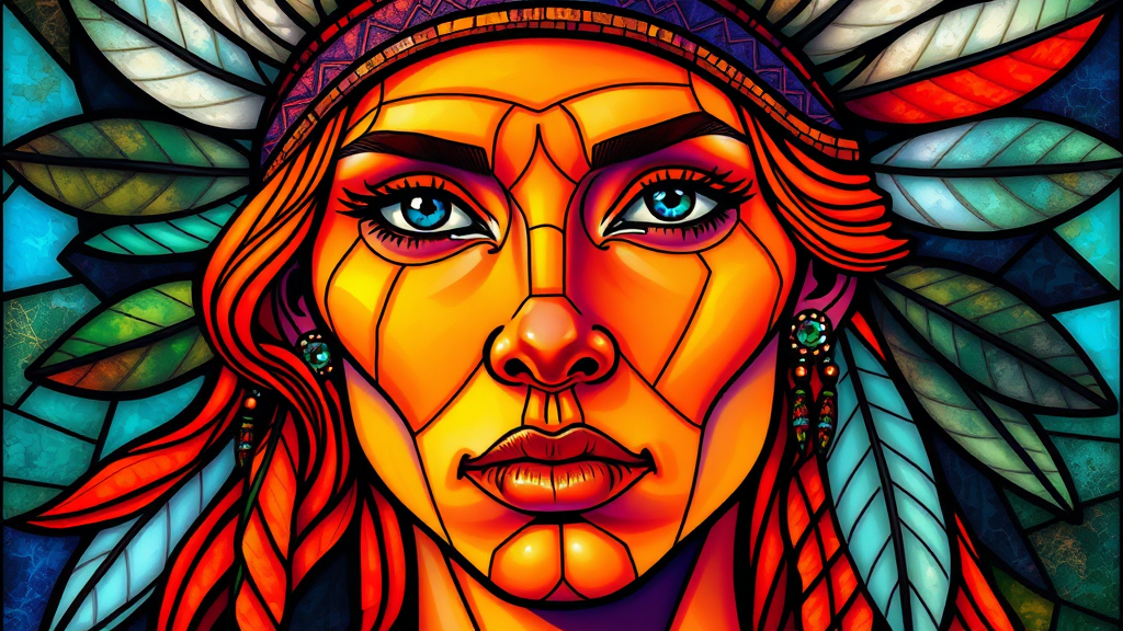 Psychedelic stained glass portrait of a North American Indian woman with feathers in her vibrant orange hair, vividly colored skin, intricately detailed, UHD, HDR, 8K, unique features, expressive eyes, elongated elements, gracefully abstract forms, harmonious symmetry, flowing lines, subtly surreal, artistic interpretation with a touch of fantasy, balanced composition, clear resolution, seamless integration of colors and patterns.