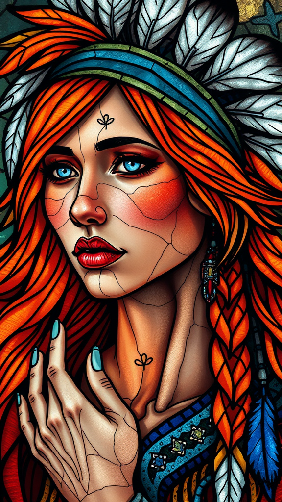 psychedelic stained glass portrait of a North American Indian woman, adorned with feathers in her vibrantly colored hair, her skin and flowing orange hair creating a mesmerizing display, crafted in UHD, HDR, 8K quality. Artistic elements feature unique expressions, elongated neck, and intricate hand details, with a surreal and abstract touch that challenges conventional beauty norms, emphasizing creativity and imagination without losing the core essence of the original inspiration.