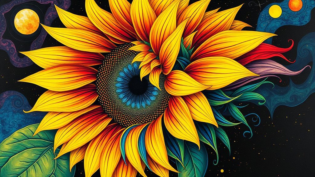 psychedelic surrealist painting of a sunflower oozing with vibrant colors, its petals melting into whimsical forms, inspired by the dreamlike worlds of Salvador Dali and the abstract geometry of Pablo Picasso, elongated and twisted at a 68:128 aspect ratio, with kaleidoscopic patterns and bold, fluid lines, rendered with a highly stylized touch