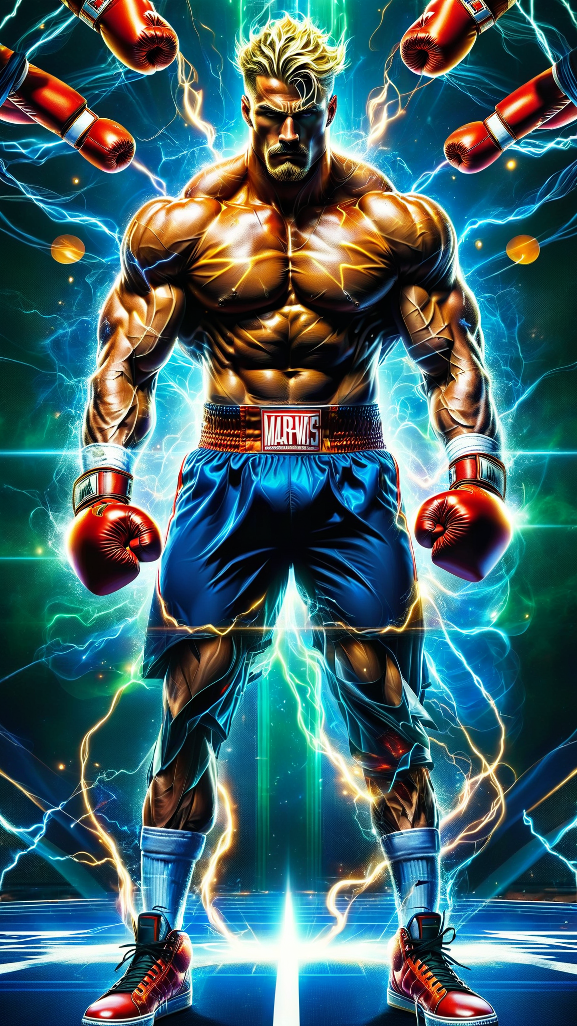 psychiatrist and psychologist for super-heroes. He is also ex-military, but still has his connections to the Marines; he is Black Ops, so they call him from time to time. He is also a very proficient boxer. When he's advising people, he wears his favorite dark blue suit with a tie and a pair of glasses. When he's boxing, he wears little more than a pair of boxing shorts and shoes. He is tall, muscular, sinewy, fit, athletic. Big muscles, broad chest and wide back, narrow waist. Handsome rugged masculine Caucasian male with mefium length golden blonde hair in a curly bob hairstyle. Malachite green eyes, strong brow and jaw, neatly trimmed blonde mustache. Full body pose, either in a gym or his office.