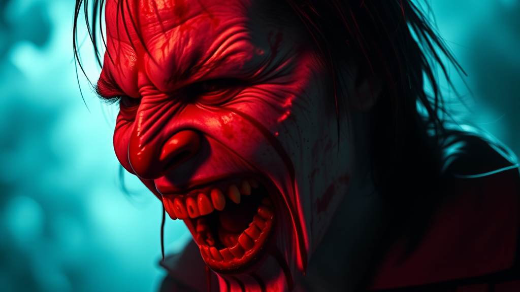psycho horror intense blood splatter sinister aura reminiscent of donnie darko menacing laughter dynamic and captivating pose with an immersive chilling background ultra high-resolution 8k raw photo hyperrealism capturing the essence of dread and fascination through the lens of dark photography eerie atmosphere and unsettling details