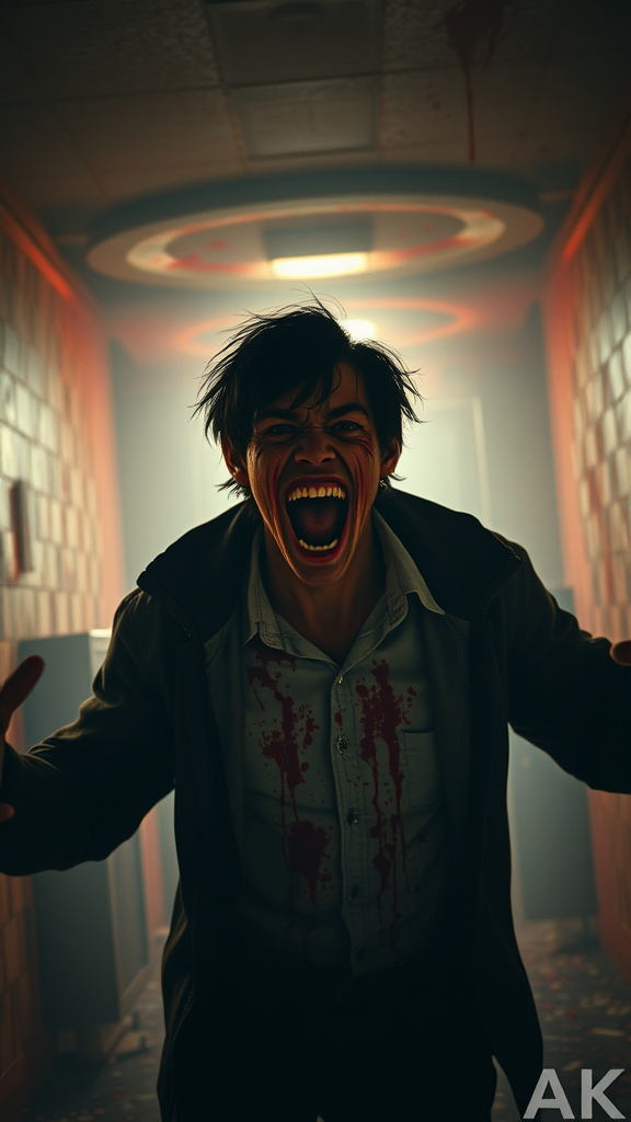 Psycho horror scene with blood splatter and a menacing aura, reminiscent of Donnie Darko, featuring a character with an evil laugh in a dynamic pose against an immersive, chilling background. The image is captured in ultra high resolution, 8k, with raw photographic detail emphasizing hyperrealism, creating a vivid and haunting atmosphere.