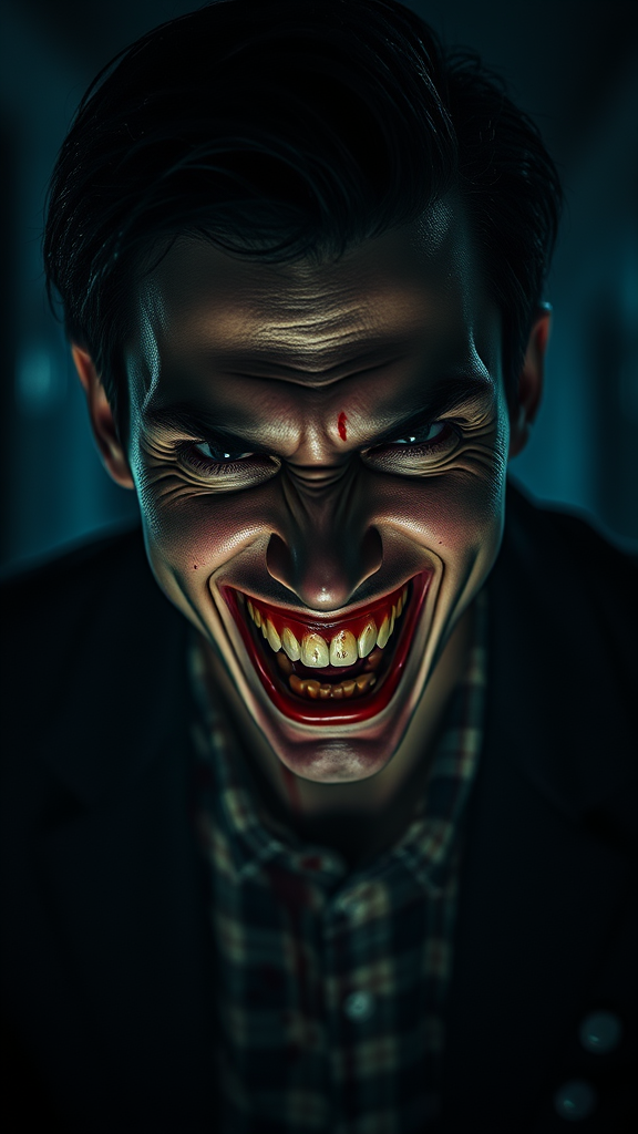 Psycho thriller, chilling atmosphere, eerie tension, unnerving horror, foreboding shadows, sinister presence, blood spatters, enigmatic vibe, reminiscent of Donnie Darko, menacing grin, dynamic and striking pose, captivating and immersive background, ultra high-resolution detail, 8k clarity, raw and intense photo, hyperrealistic style, atmospheric photography, hauntingly vivid elements, mood of suspense and intrigue.