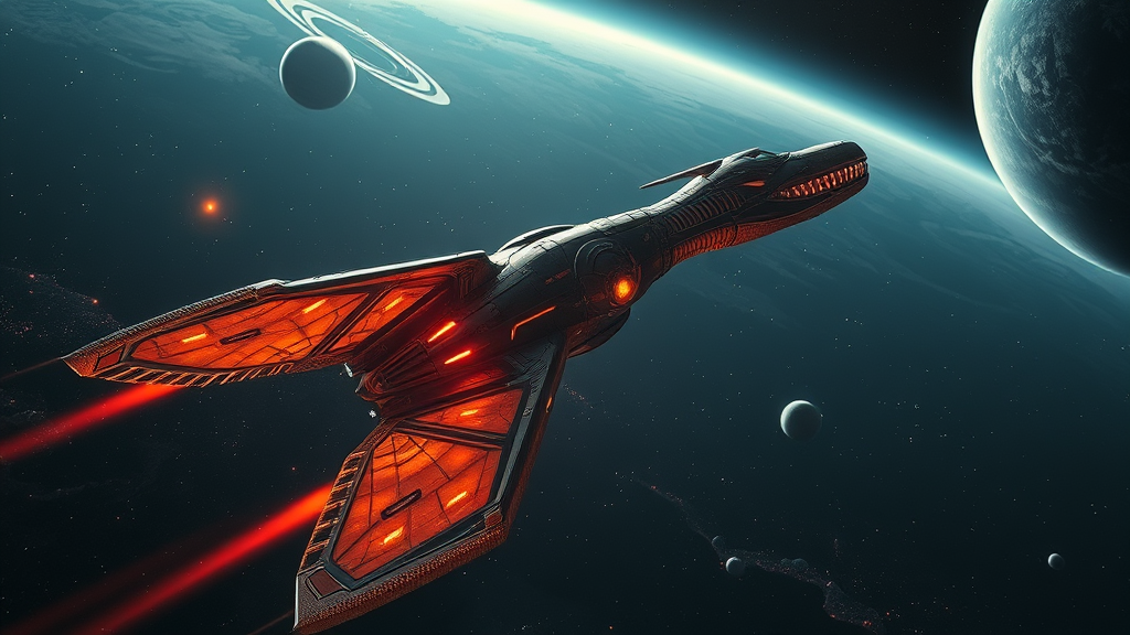 Pterodactyl-inspired space fighter soaring through deep space, featuring intricate textures and high-tech sci-fi design elements, evoking the aesthetic of a homeworld game. The scene is illuminated by the soft glow of distant stars, capturing a dynamic and cinematic moment with a God's-eye view. Dramatic colors paint the canvas, creating a photorealistic digital illustration. This distant, highly detailed shot is presented in HD, 8K, utilizing Super-Resolution technology. In the background, planets loom with cropped edges, adding depth and context, while subtle artefacts lend a touch of realism.