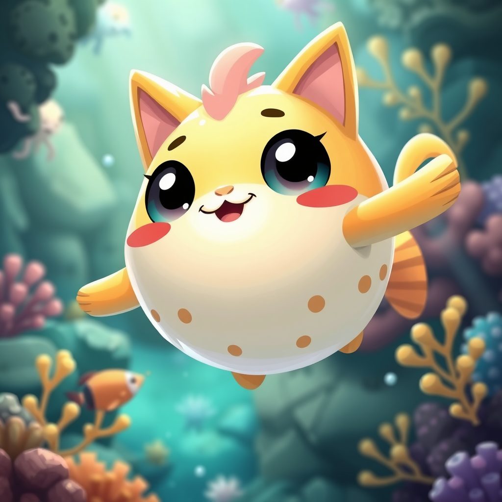 Puffy the pufferfish cat, the guardian of the seas and its inhabitants, ventures through colorful coral reefs and mysterious underwater caverns, using its whimsical charm and unique abilities to defend the ocean's delicate balance and ensure harmony among its diverse creatures.