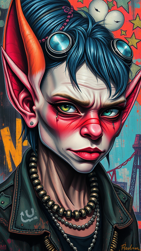 Punk elf portrait in the mdjrny-v4 style, highly detailed and vivid, capturing a neo-expressionist essence influenced by Julian Schnabel and Diego Rivera. The painting on canvas features the elf with vibrant, rebellious accents and intricate textures, set against a dynamic and colorful background that blends elements of urban grit and fantastical whimsy.
