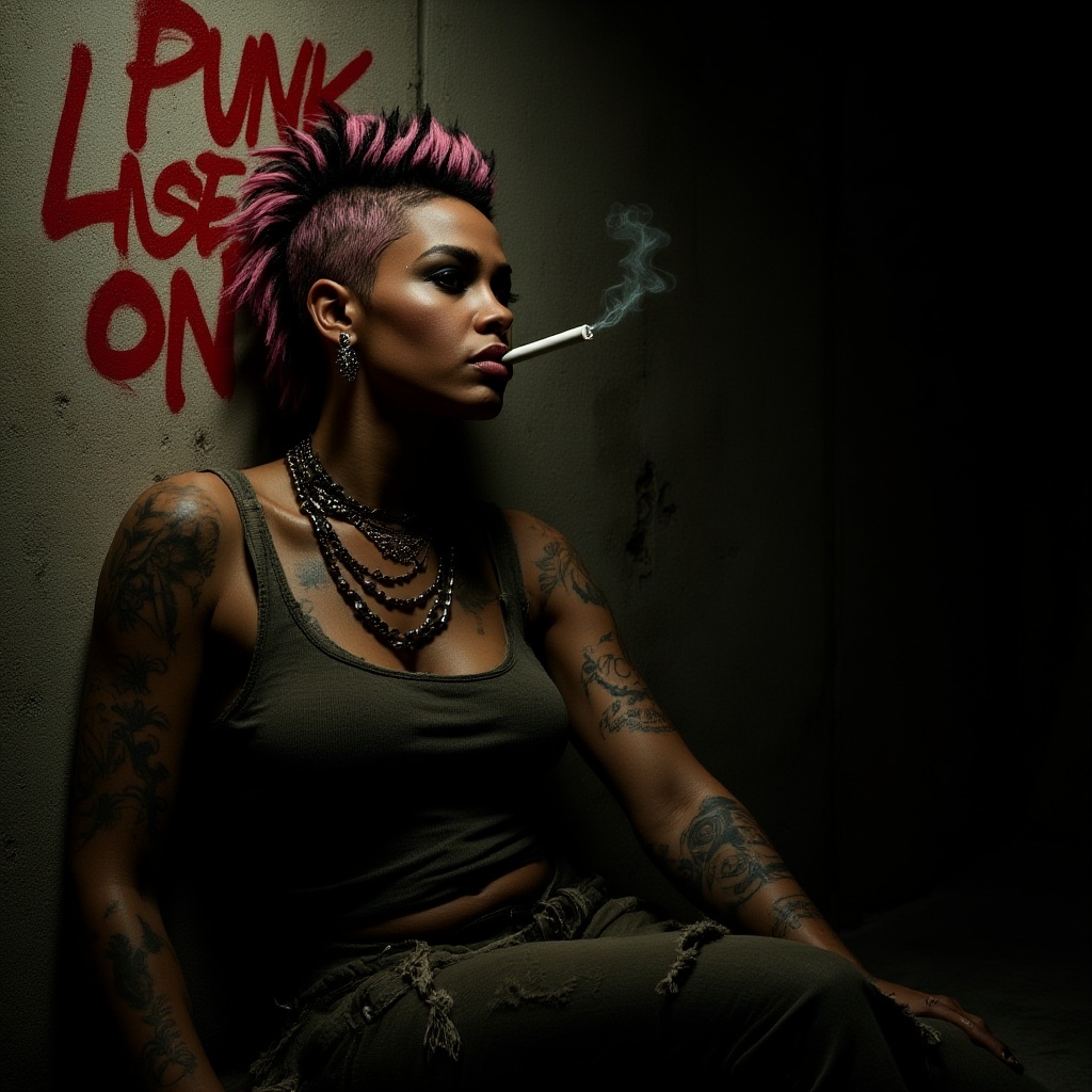 View this AI-generated image featuring a slender punk female reclines against the gritty wall of a dimly lit alley savoring a short cigarette the bold red graffiti declaring punk lives on just above her shoulder her hyper realistic intricately detailed dreads blend shades of pink and black framing a