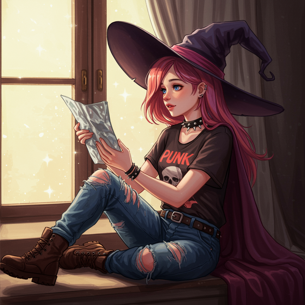 View this AI-generated image featuring punk inspired aesthetic enchanting illustration sitting by a window holding a sheet of metal in outstretched hands wearing a punk style t shirt adorable with ripped jeans donning a witch hat semi transparent in a vintage room model shoot vibe high saturation an
