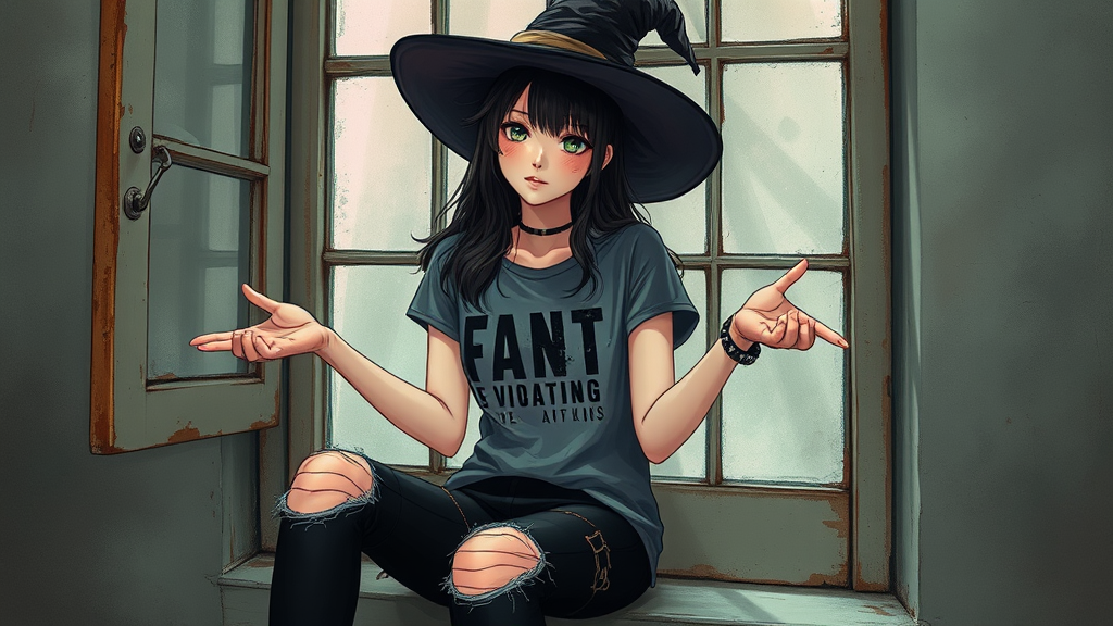 Punk-inspired scene featuring a beautiful illustration of a young woman sitting by an aged window, holding a glimmering sheet of metal in her outstretched hands. She wears a punk-style T-shirt paired with stylishly torn leggings, complemented by a whimsical witch hat. Her look is enhanced with translucent elements adding an ethereal vibe in the vintage room setting. Captured with a model-shoot aesthetic, the scene bursts with high saturation, highlighting her angelic presence. Her sweet, anime-like face is adorned with a pretty visage and a sheer blush on her cheeks, drawing focus solely on her. The atmosphere is enriched by volumetric lighting, presenting a strikingly beautiful 8K illustration of one girl in casual punk attire, unified by a captivating blend of mystique and casual charm.
