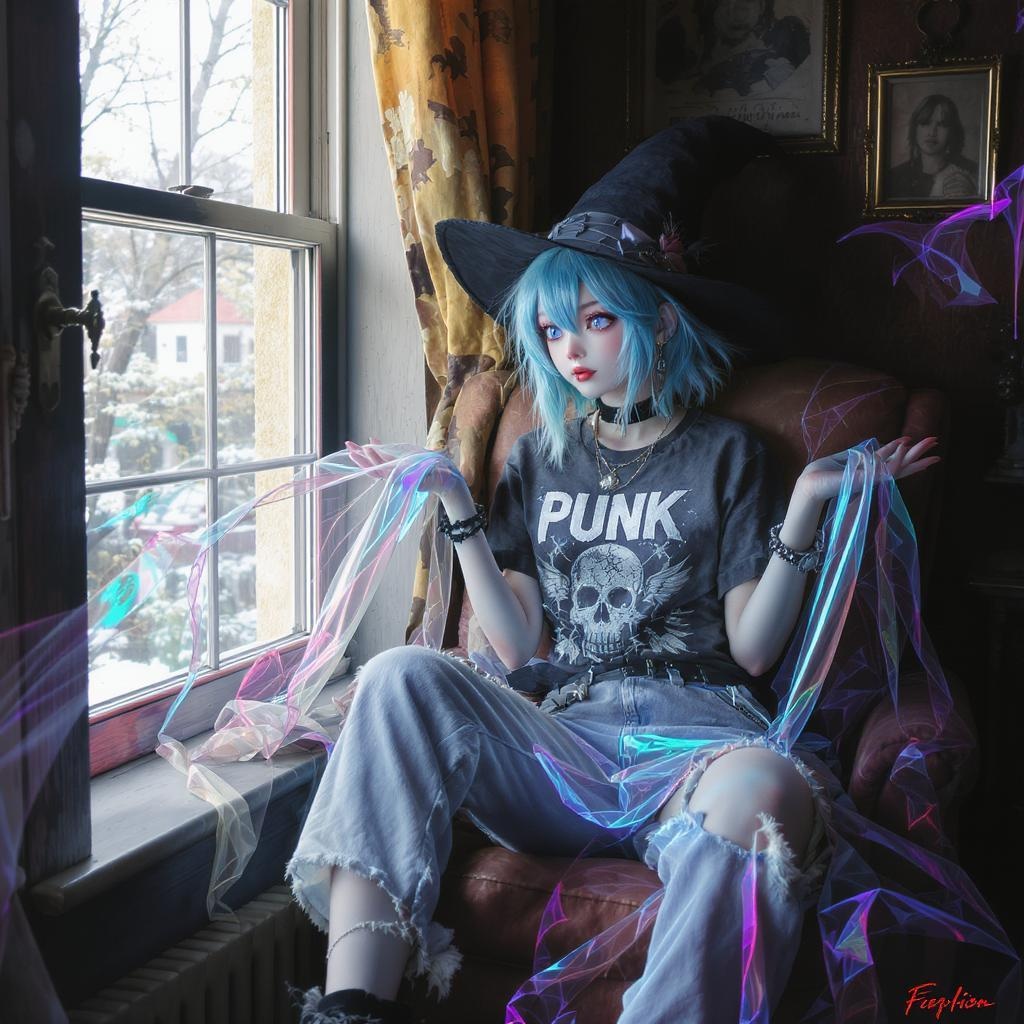 Punk-inspired style, stunning illustration, seated by the window, with a shimmering sheet in outstretched hands, wearing a punk-style T-shirt, adorable, distressed legwear, a witch hat, semi-transparent, in a vintage room, fashion shoot vibe, vibrant colors, ethereal female angel, charming anime-esque woman face, attractive visage, subtle blushing cheeks, concentrated focus, volumetric lighting, captivating illustration, one girl, relaxed attire, punk T-shirt, endearing, torn pants, witch hat, translucent, 8K quality.
