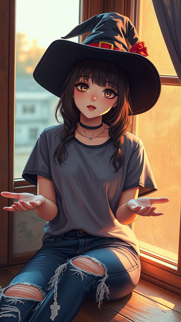 Punk style, beautiful illustration of a girl sitting by the window, holding a shimmering sheet of metal in outstretched hands, wearing a punk-style T-shirt. She has cute, torn jeans and a witch hat that glimmers translucently under the warm light in an old, character-filled room. Captured in a model shoot style with high saturation, she exudes the aura of a female angel with a sweet, anime-like face, sporting a sheer blush on her cheeks. The focus is solely on her, highlighted by enigmatic volumetric lighting. The scene is rendered in stunning 8K detail, emphasizing her casual attire and punk aesthetic, with the metal sheet reflecting the ambient light softly.