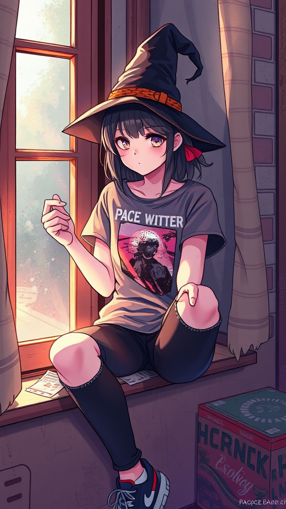 Punk style, captivating illustration, a girl sitting by the window holding a shimmering sheet of metal in her outstretched hands, wearing a punk-style T-shirt, charming and edgy with torn leggings, a whimsical witch hat slightly askew, the room surrounding her is vintage and worn, infused with a sense of nostalgia, model-like poise captured with vibrant and high-saturation colors, ethereal female angelic presence, anime-inspired sweet expression with captivating eyes and a delicate, pretty face, a touch of blush highlighting her cheeks, her focused solitude accentuated by volumetric lighting, creating a dramatic ambiance around her, an exquisite illustration, the girl in casual attire exudes punk flair, her outfit a mix of rebellion and cuteness, with ripped pants and a translucent allure, rendered in stunning 8K quality.
