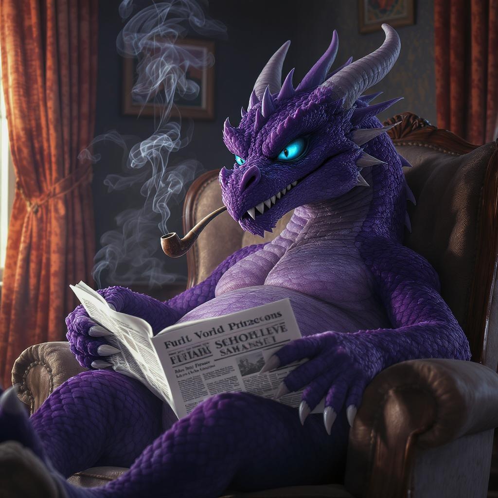 A massive purple dragon with a mischievous glint in its kind, cerulean eyes sits casually in a vintage armchair, its long spikes casting playful shadows. Wisps of smoke curl upward from a sleek pipe nestled in its mouth, while its claws delicately grip a futuristic newspaper. The scene is bathed in a soft, cinematic glow, blending retro charm with a hint of modernity.