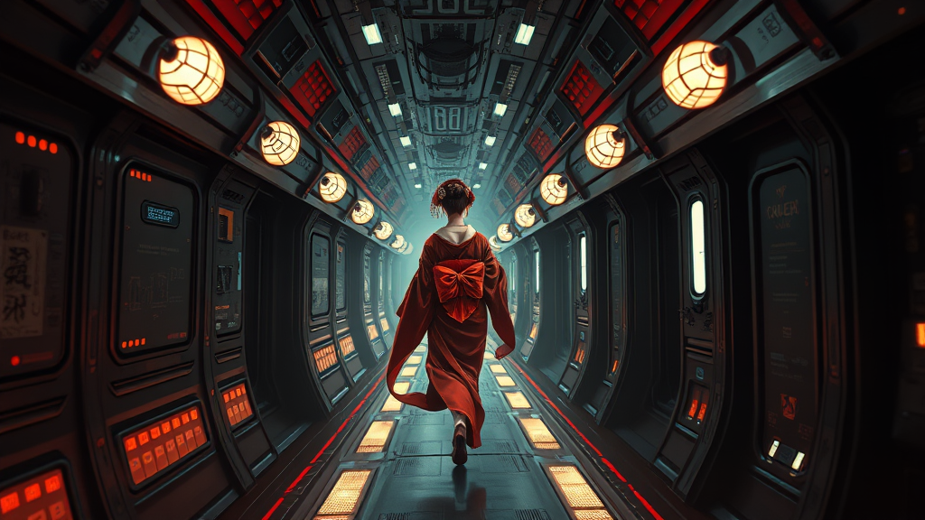 Queen Amidala as a cybernetic geisha, adorned in a striking red kimono, navigates the shadowy corridors of an enigmatic fantasy spaceship. The scene, rendered in the distinct style of artist Oyari Ashito, combines anime and manga graphics with exquisite detail. Flickering lights illuminate her path, highlighting the graceful speed of her movement in a high-resolution 8K UHD portrait from a third-person perspective. Halogen lamps cast a moody glow, enhancing the interplay of shadows and light in this mesmerizing, otherworldly setting.