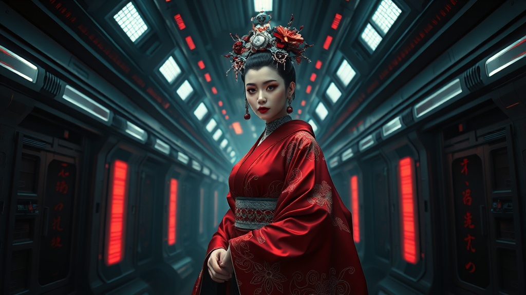 queen amidala as a cybernetic geisha with a flowing red kimono, standing in the shadowy corridors of a surreal fantasy spaceship, showcasing the artistic style of oyari ashito with intricate anime and manga graphics. Her attire reflects super detailed craftsmanship, under flickering lights creating a sense of motion and speed, captured in 8K UHD with ultra-high resolution. The portrait is viewed from a third-person perspective, enveloped in moody halogen lighting that highlights her serene yet enigmatic presence.