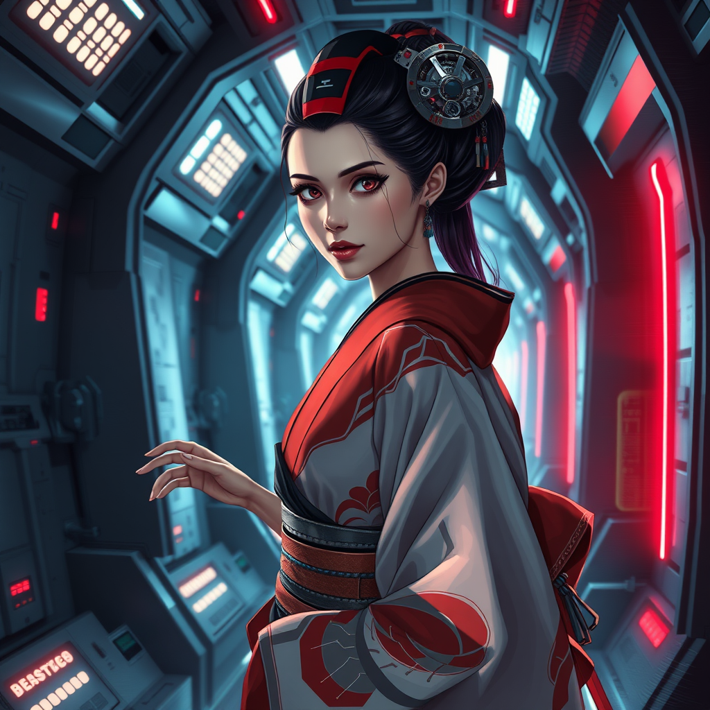 Queen Amidala reimagined as a cybernetic geisha with a crimson kimono, navigating the shadowy halls of a mythical starship, in the signature style of artist Oyari Ashito, blending anime and manga artistry. The scene is intricately detailed, with dynamic, flickering lights accentuating her every movement, captured in stunning 8K UHD. A portrait, seen from a third-person perspective, features halogen lights casting moody shadows, infused with a sense of speed and fluidity.