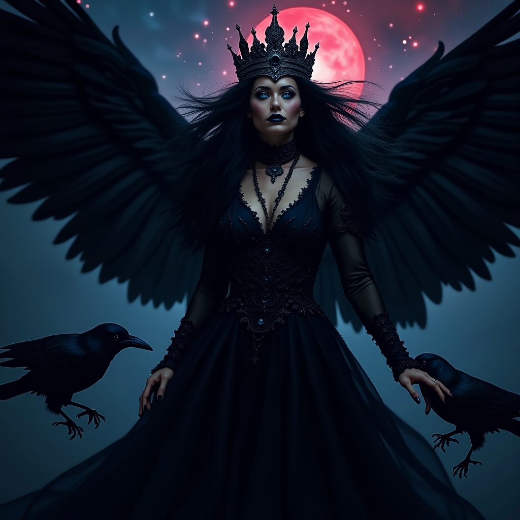 A breathtaking queen of ravens, caught in decisive motion, embodies the allure of a dramatic femme fatale. Adorned in black plumes and commanding her loyal ravens, she exudes power. Her lips are painted a deep black, contrasting with her icy blue eyes the color of Pantone 2766. Her flowing black hair, reminiscent of a mystical World of Warcraft character, cascades down her shoulders. She emerges from a psychedelic scene, as if from a cosmic birth canal, clad in a silk gossamer dress that drapes light and ethereal. Set against a backdrop of stars and galaxies, this full-body portrait captures her regal presence. In a style inspired by Greg Rutkowski, her ornate crown glimmers. A low angle perspective highlights her majestic stance, as god rays and radiant light surround her and an iridescent red halo provides a striking contrast. The scene unfolds with ultra-realistic, hyper-detailed artistry, blending dark fantasy with atmospheric hyperrealism. Set within a meticulously detailed environment, the illustration is macabre yet awe-inspiring, offering an epic wide shot that feels like a still from a cinematographic masterpiece.