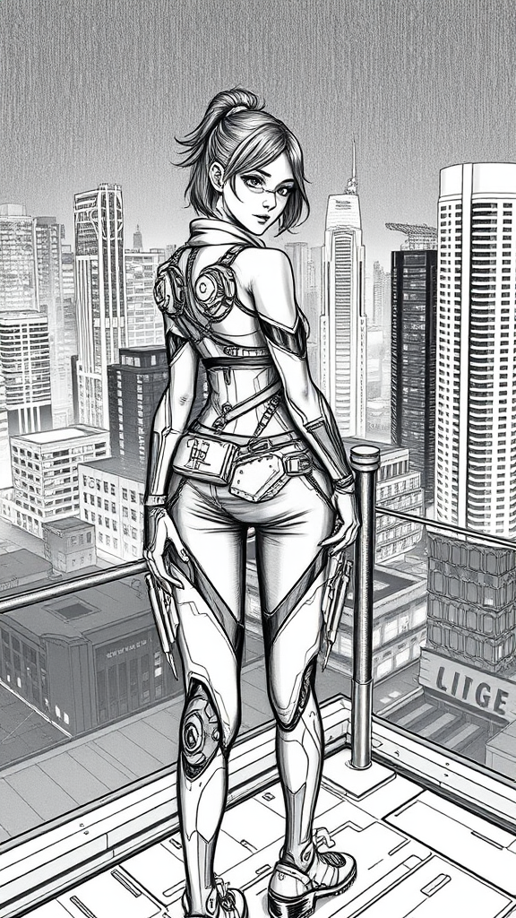 Queen in her late teens, wearing a sleek metallic cyberpunk outfit adorned with high-tech gadgets, stands on a rooftop at night, overlooking a vibrant high-tech urban landscape. The scene is captured in a medium shot, with intricate 2D crosshatching and inked lines that bring out sharp, detailed features. The artwork is rendered in high-definition, 8K resolution, ensuring the best quality and resolution. The mood is enhanced by grayscale tones, lending a unique monochrome aesthetic, while the scene remains devoid of any text, signature, watermark, or logo.