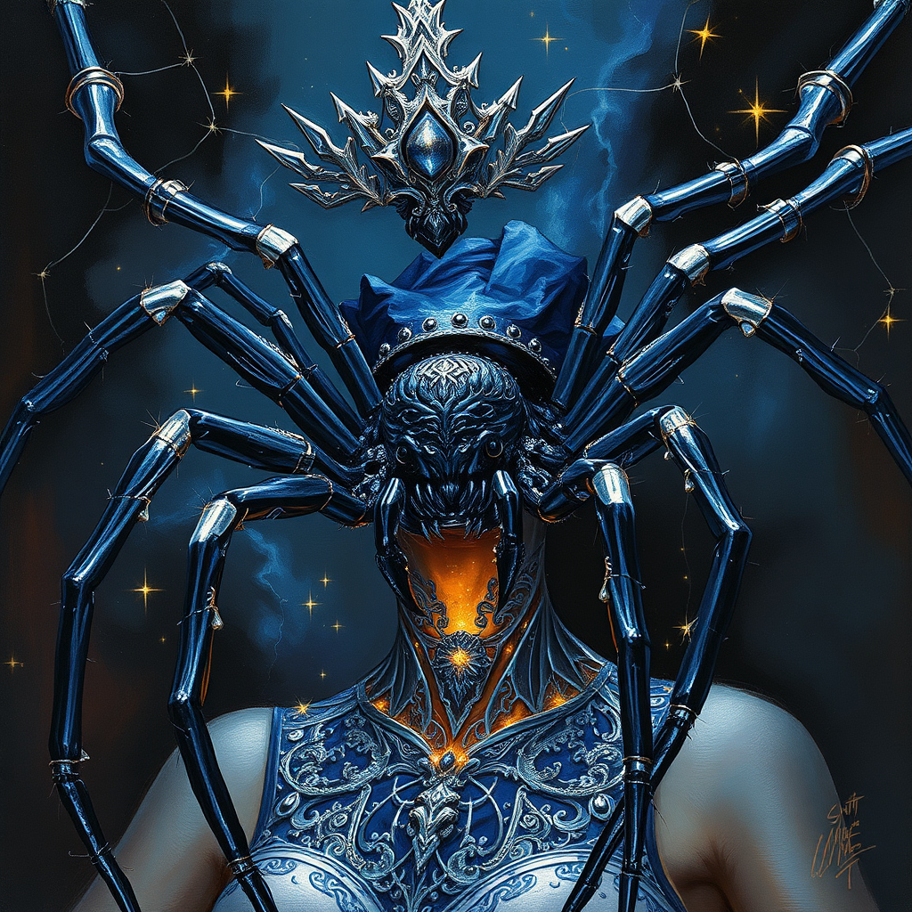 Queen of spiders, eledrae by taijen 3, in the style of Boris Vallejo, dark sapphire and silver, luminous transformation, trompe-l'œil illusionistic intricacy, modern spider queen, bold brushstrokes, stripcore aesthetic --ar 1:2 --v 5 --s 300 --q 5 --upbeta --v 5