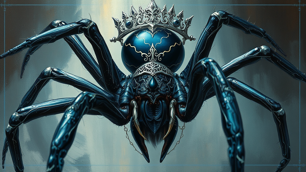 Queen of spiders in a mesmerizing metamorphosis, a contemporary fusion of dark sapphire and silver hues, her form echoing the style of Boris Vallejo. She mesmerizes with illusionistic trompe-l'œil details, large brushstrokes capturing her otherworldly elegance. The embodiment of eledrae, her presence is both regal and enigmatic, a masterful spider-woman with subtle yet striking creative twists on her original essence.