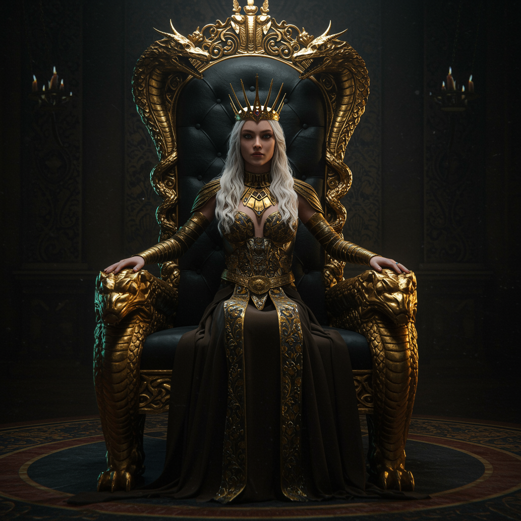 A stunning queen seated on a magnificent black throne, exquisitely crafted from gold and adorned with serpent-dragon motifs and ornate detailing. The scene is bathed in dramatic lighting, showcasing hyperrealism and photorealism with cinematic flair. The image possesses an 8k sharp focus, enhanced by Unreal Engine 5 effects, conveying an expressive 2D style. The queen’s regal poise and captivating presence are perfectly captured, set against a backdrop of intricate patterns that echo the throne's design. The composition is balanced and harmonious, with every element contributing to the overall majesty of the scene.
