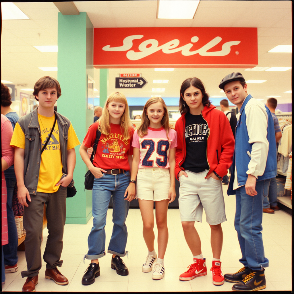 Quirky snapshots of 90s mall kids in vintage outfits, captured on fuzzy VHS for a nostalgic vibe.