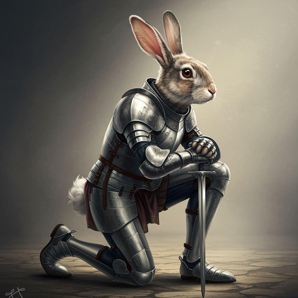 View this AI-generated image featuring a majestic rabbit knight in a graceful kneeling pose adorned in intricately designed armor shimmering in silver tones with accents of rich silk woven into the ensemble the cinematic lighting beautifully highlights the fine details capturing the elegant curves a