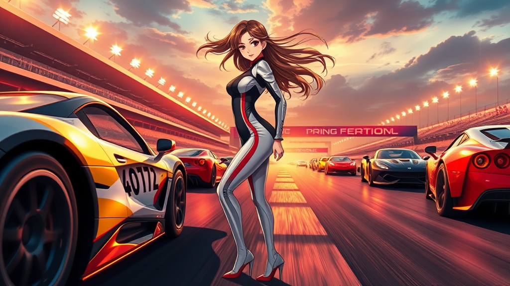 Race track, dramatic lighting, high-speed cars, inspired by Redline anime and Madhouse, stunning girl with model-like features, slim waist, perfect figure, long elegant legs, flowing hair, wearing a sleek racing suit, tight-fitting attire, full-length view, posed elegantly at a racing festival, wind playing through her hair, perfect symmetry, ultra-detailed, high resolution, striking contrast, anime style, vibrant drawing, 8K quality, HD clarity, super-resolution, manga-inspired graphics, capturing the thrill and excitement from a first-person perspective.