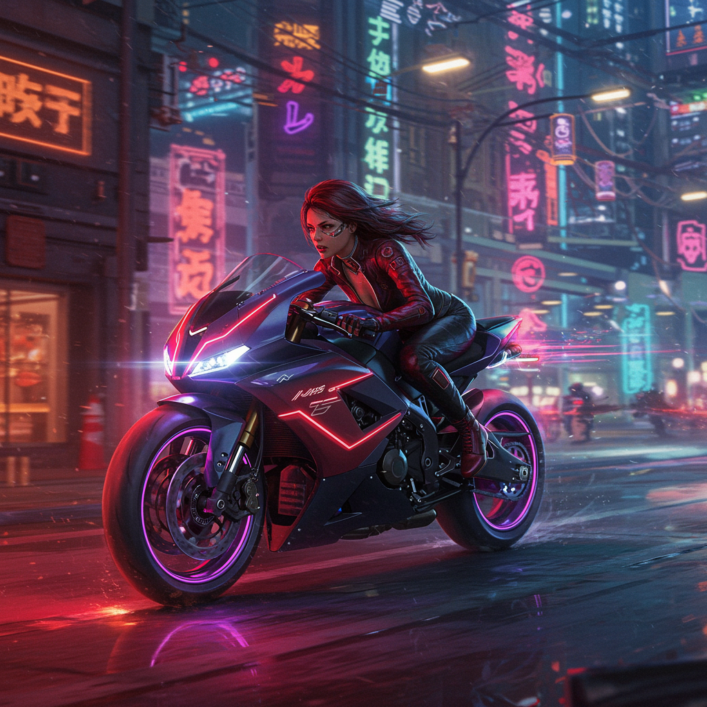 A woman races through a neon-drenched cyberpunk cityscape on a sleek motorcycle, vibrant lights flickering across the bike's surface as she accelerates. Her form-fitting red and black outfit hugs her frame as she navigates the urban jungle at breakneck speed, creating a virtual blur streaking behind her. The city street is alive with motion, teeming with dark tension and suspense, captured in photo-realistic detail with dramatic lighting that illuminates her intense expression. This cinematic masterpiece, painted in high resolution, showcases a vivid action scene filled with palpable energy, intricate details, and a sense of thrilling urgency.