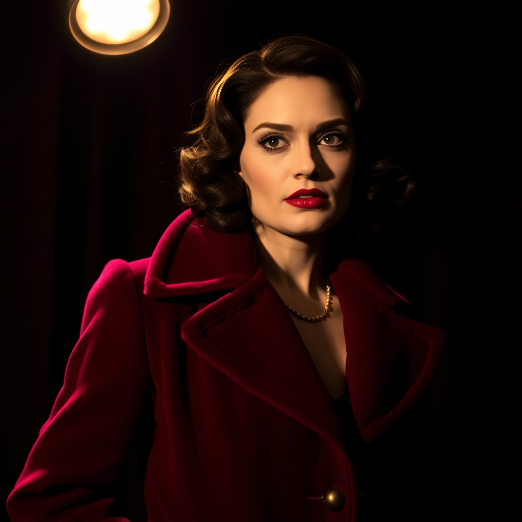 Rachel Weisz in vintage crimson opera coat, illuminated by a single spotlight in Art Deco elegance, high-contrast close-up, mystical "dark femme" allure, 1950s Old Hollywood inspired, rich plum and garnet hues on velvety black, wistful, 11:16.