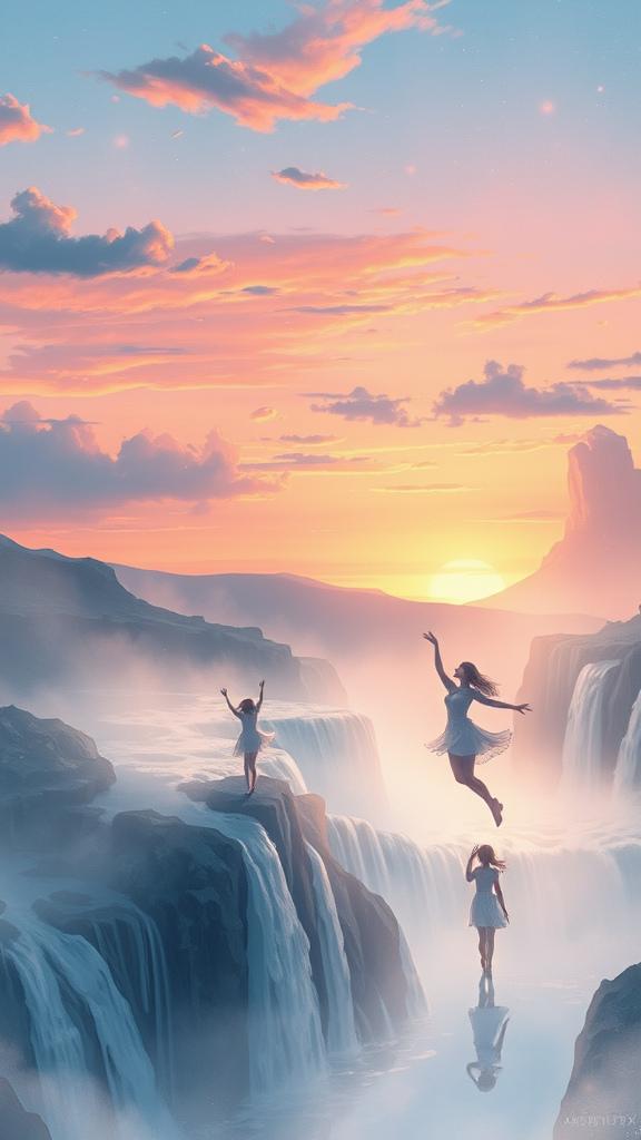 Rachey13x dreaming in a surreal landscape, gentle hues blending into one another as soft light cascades upon a serene twilight scene, with elongated shadows stretching across the horizon. Ethereal figures dance gracefully amidst cascading waterfalls, painting a harmonious picture of tranquility. The scene evokes a sense of wonder and peace, as delicate wisps of clouds float by, adding an element of dreamy mystique to the serene setting.