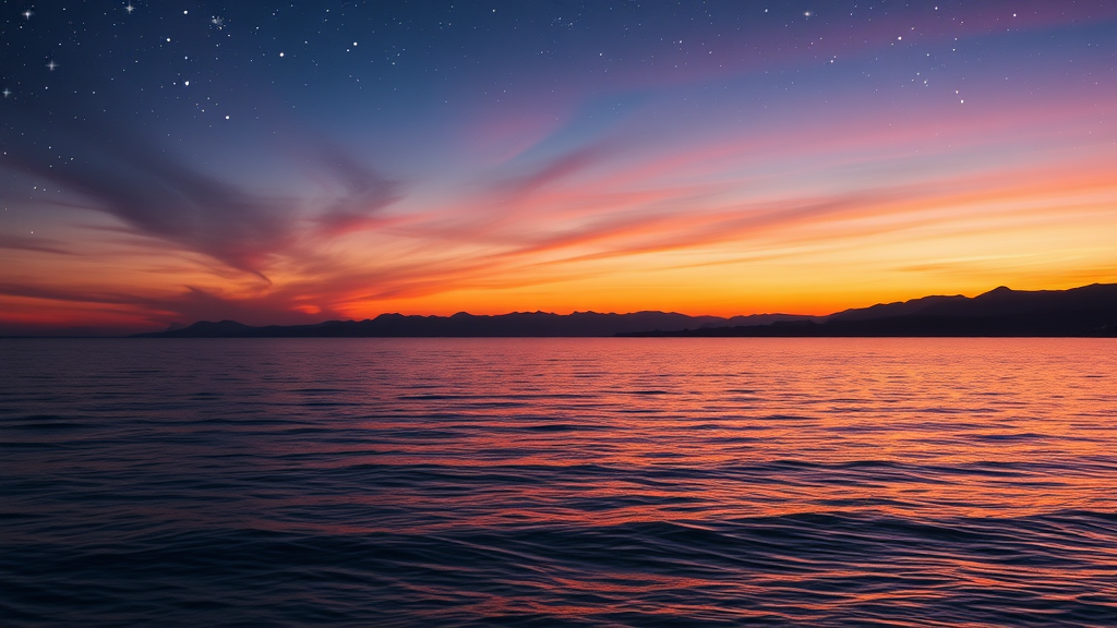 Rachey13x --q 2.5 --s 800 --ar 10:20, featuring a serene twilight landscape where shimmering stars cascade gently onto a tranquil sea, the horizon framed by a silhouette of distant mountains, creating an ethereal tapestry of colors that weave through the twilight sky.