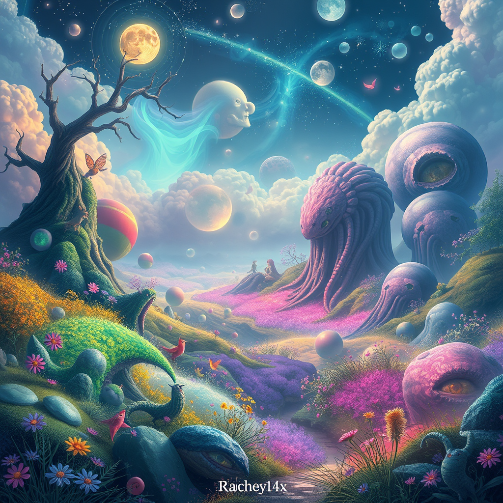 Rachey14x in a dreamlike landscape with vibrant colors and ethereal creatures, a sense of whimsy and imagination infused in every detail, atmosphere lush and calming, aspect ratio 9:18.