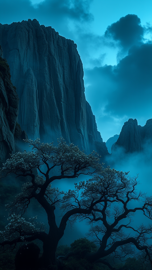 Rachey14x --q 3 --s 760 --ar 10:20 evokes an ethereal landscape at twilight, where the sky is painted in deep shades of indigo and silver. Towering cliffs rise dramatically, their rugged surfaces bathed in a soft, otherworldly glow. Wisps of mist float gracefully, weaving through clusters of ancient, twisted trees whose leaves shimmer like tiny stars. The scene is serene and mystical, inviting viewers into a forgotten realm where time seems to stand still and the air is filled with a faint, melodic whisper.