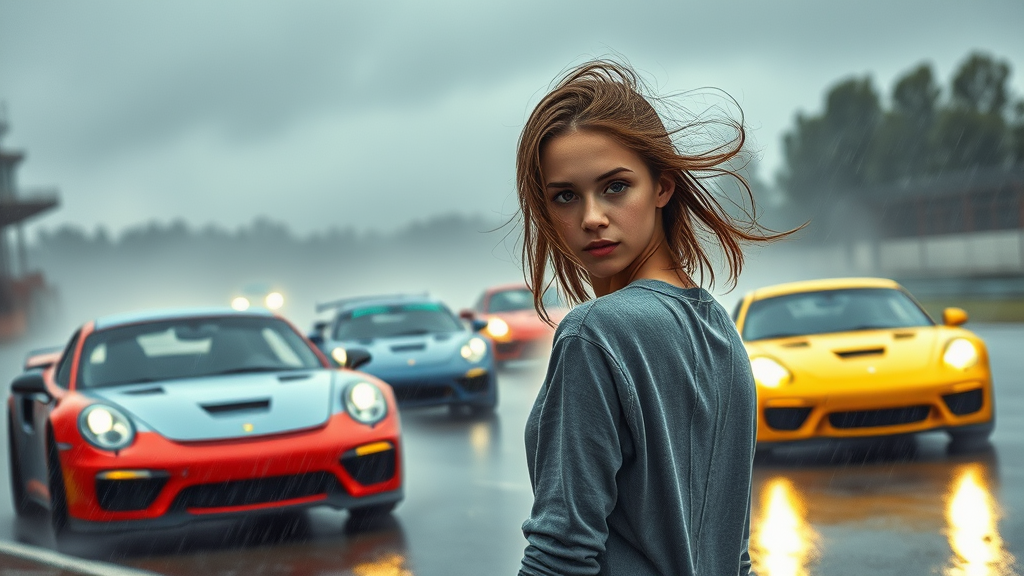 Racing cars speed through a rain-soaked track, the swiftness of their movement contrasting with the grey, stormy skies that loom overhead. Raindrops splatter against windshields and headlights pierce through the misty haze. Among them, a girl stands at the edge of the track, her expression focused and intense, her hair whipped by the gusty winds, embodying a calm presence amidst the chaotic, high-octane scene.
