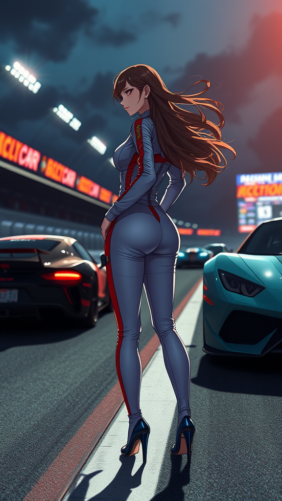 Racing track under dramatic lighting featuring sleek racing cars reminiscent of Nascar, inspired by Redline anime and Madhouse. A stunning model-esque girl with a perfect figure and graceful posture stands in a long, tight, form-fitting racing suit. Her long, beautiful hair flows in the wind, and her slim waist and long legs create an elegant symmetry. She is captured in a full-length, long shot, embodying the excitement of a racing festival. The image boasts ultra-detail, high resolution, high contrast, and anime aesthetics with a manga graphic style, presented in 8K HD super-resolution from a first-person perspective.