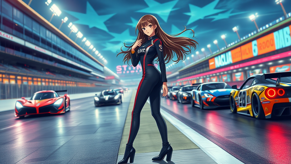 Racing track, vibrant race track, thrilling Nascar scene, intense lighting, sleek racing cars, inspired by Redline anime aesthetics, crafted by Madhouse, featuring a stunningly beautiful girl with model-like charm, elegant posture, slim waist, perfect figure, long elegant legs, cascading long hair, form-fitting racing suit, tight-fitting design, dynamic long shot, graceful full-length pose, lively racing festival ambiance, gentle wind effect, perfect symmetry, ultra-detailed artistry, high resolution, striking high contrast, anime-inspired illustration, 8K and HD clarity, manga-style graphics, immersive first-person view, exceptional super-resolution quality.