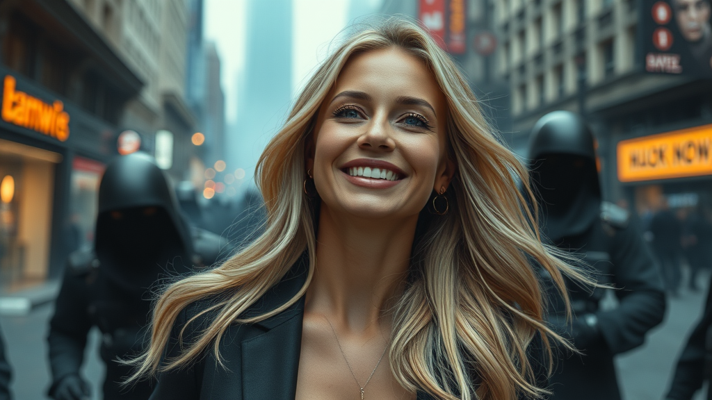 Radiant blonde woman thriving amidst chaos after a bomb assault in a city teeming with ominous figures, captured in ultra HD, exudes elegance in a parfum ad with her captivating smile.