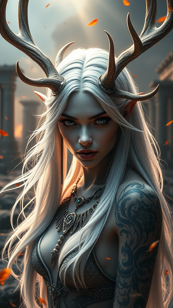 Radiant deity, enchanting and ethereal, with an aura that captures the soul. Her elegant deer antlers frame her face, while her silken white hair cascades down her shoulders. Her pale skin is adorned with intricate tattoos and exquisite jewelry that catches the light. This furious, unrelenting demoness embodies a fierce beauty with mesmerizing, detailed eyes that animate her expression. Set against a backdrop of apocalyptic beauty with swirling fire particles and drifting autumn leaves, she stands amid ancient ruins, illuminated by mystical volumetric light. A fusion of enchanting art and realistic photography brings this striking model to life, reminiscent of mythical game characters.