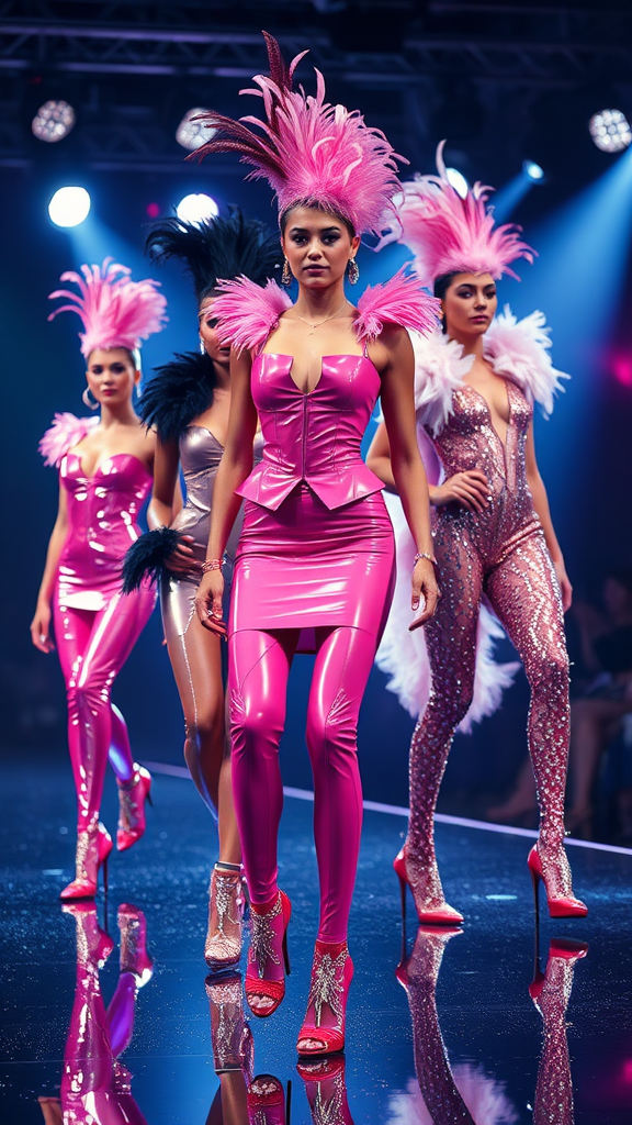 Radiant ensembles, high fashion: models adorned in sleek pink glossy leather, elegant crow feather accents and lush boas, towering high heels, shimmering with glitter, exquisite detailing and runway flair, illuminated under the bright spotlights --ar 4:5.